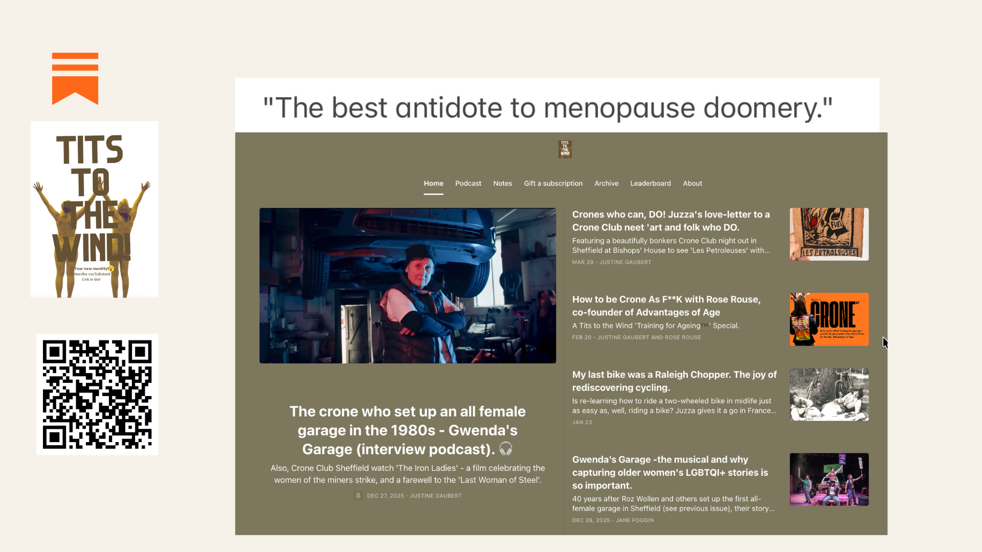 Two years ago I started‘Tits to the Wind!’ on Substack to see if we could raise money to keep Crone Club going. I write about the highs and lows of midlife and menopause from a northern lass perspective, and invite kick-ass older women to share the stories of their lives before they are lost to history. You can sign up for free for my monthly ramblings here.