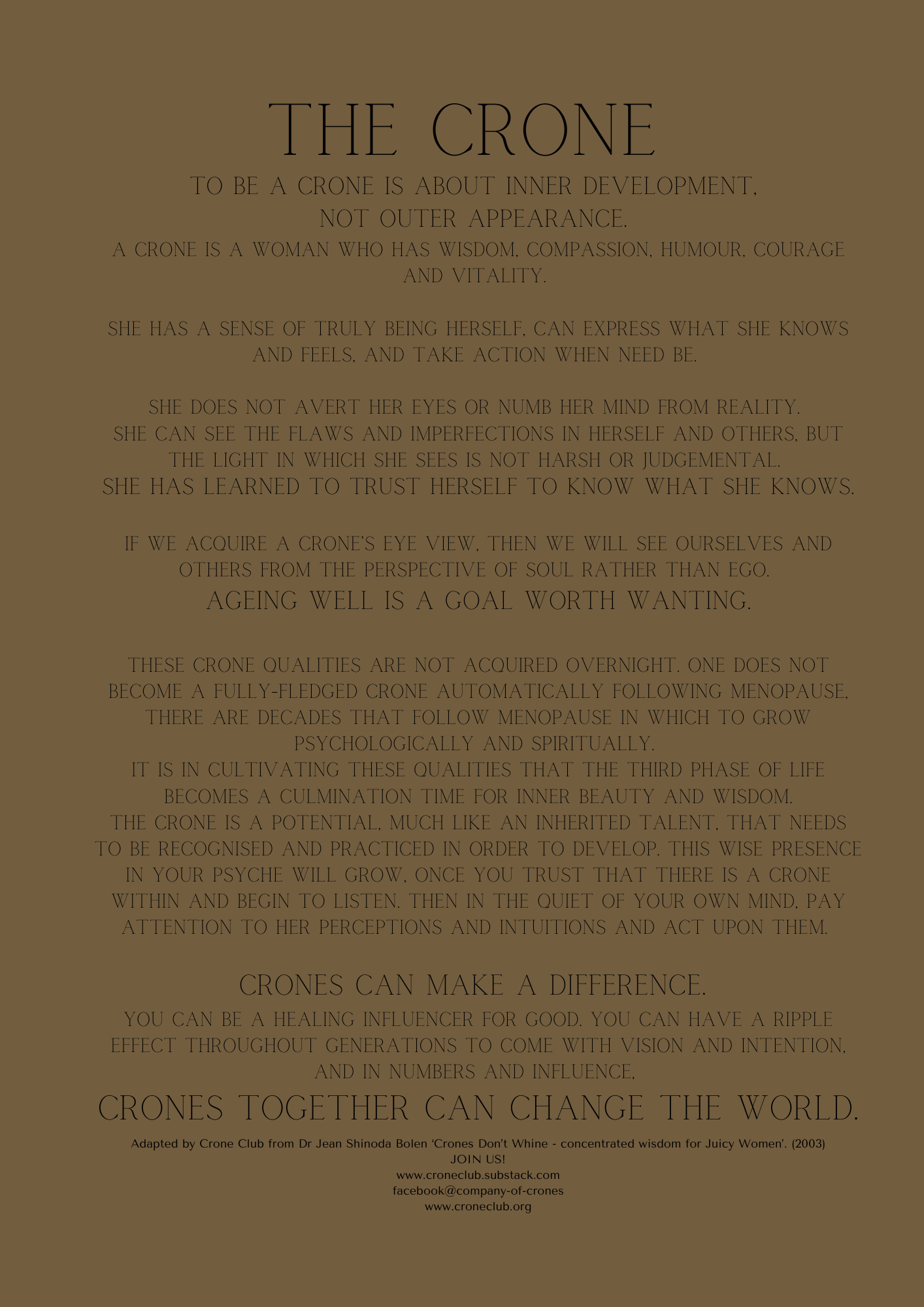 Free membership of the Crone Club Private Members Facebook group, where you can also share and promote your crone-related events and projects.