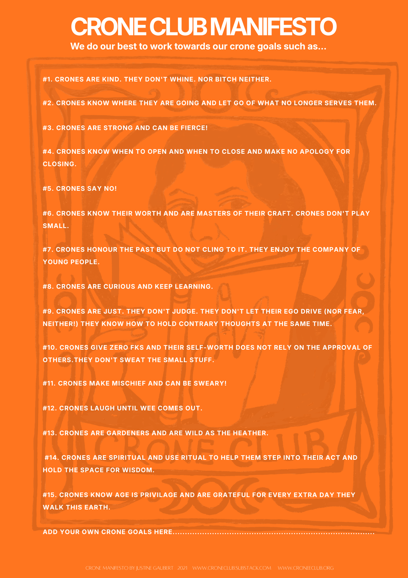 Anyone can join our bi-monthly e-newsletter on Substack. You'll get a meaty piece of creative journalism from Crone Club Founder Juzza (+occasionally other guest crone writers and our crone correspondents). Articles range from: